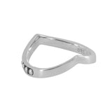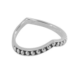 Anillo de plata de ley 925 con forma de V en la parte superior e inferior. Por un lado la V cuenta con bolitas de plata  envejecidas y por el otro la V es lisa. De 2 mm de ancho.