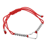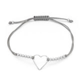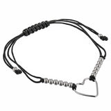 Pulsera con cordón de nylon de máximo 23 cm de largo, con corazón de plata de ley 925 de 1 cm y 12 bolitas de plata de ley 925 de 2 mm. Nudo corredizo y baño de rodio